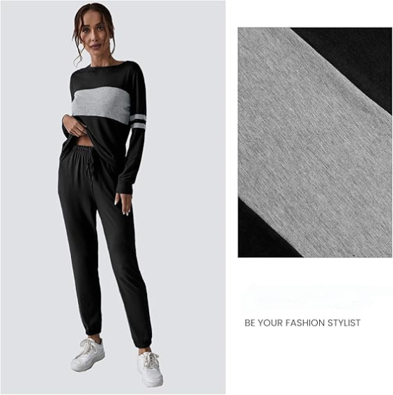 Stylish design: The shirt features color-blocked stripes and is paired with drawstring sweatpants.