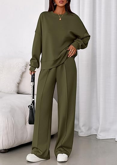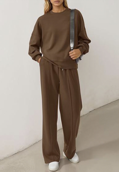 Fashion Features: Crew neck sweatshirt, loose-fitting sweatpants, casual knit set.